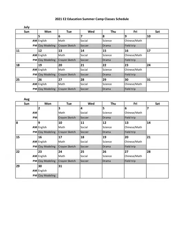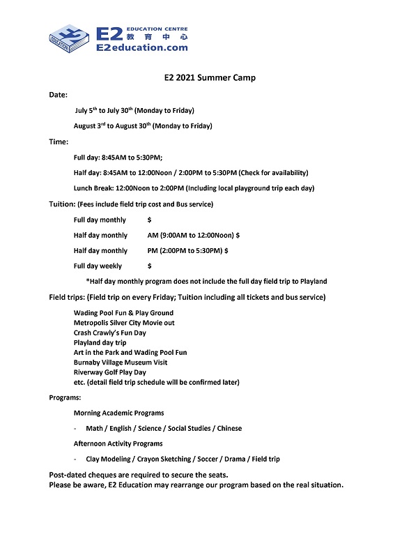 We are now accepting the registration for E2 2021 Summer Camp Program. Our two months Summer Camp Program are full days from July 5th to July 30th,2021 and Aug.3rd to Aug.30th,2021, below are detailed information.