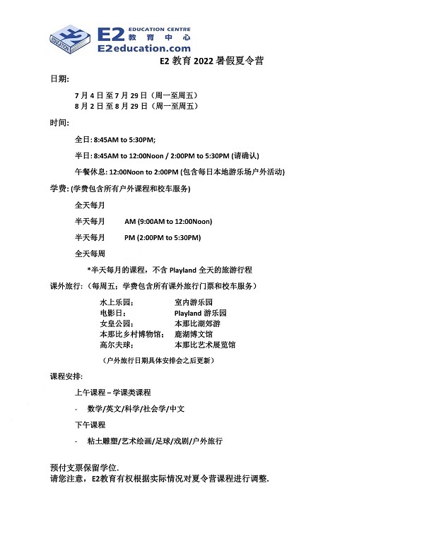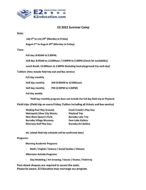 We are now accepting the registration for 2022 Summer Camp Program. Our two months Summer Camp Program are full days from Jul. 4th to Jul. 29th,2021 and Aug. 2nd to Aug. 29th ,2022, below are program schedule and field trips schedule.